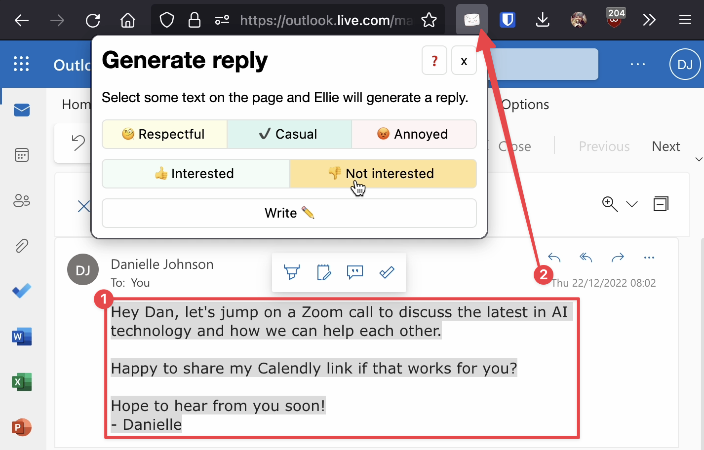 Highlight some text on the page to give Ellie context for the reply and click the toolbar icon for Ellie. Select your tone and if you're interested, and click write!