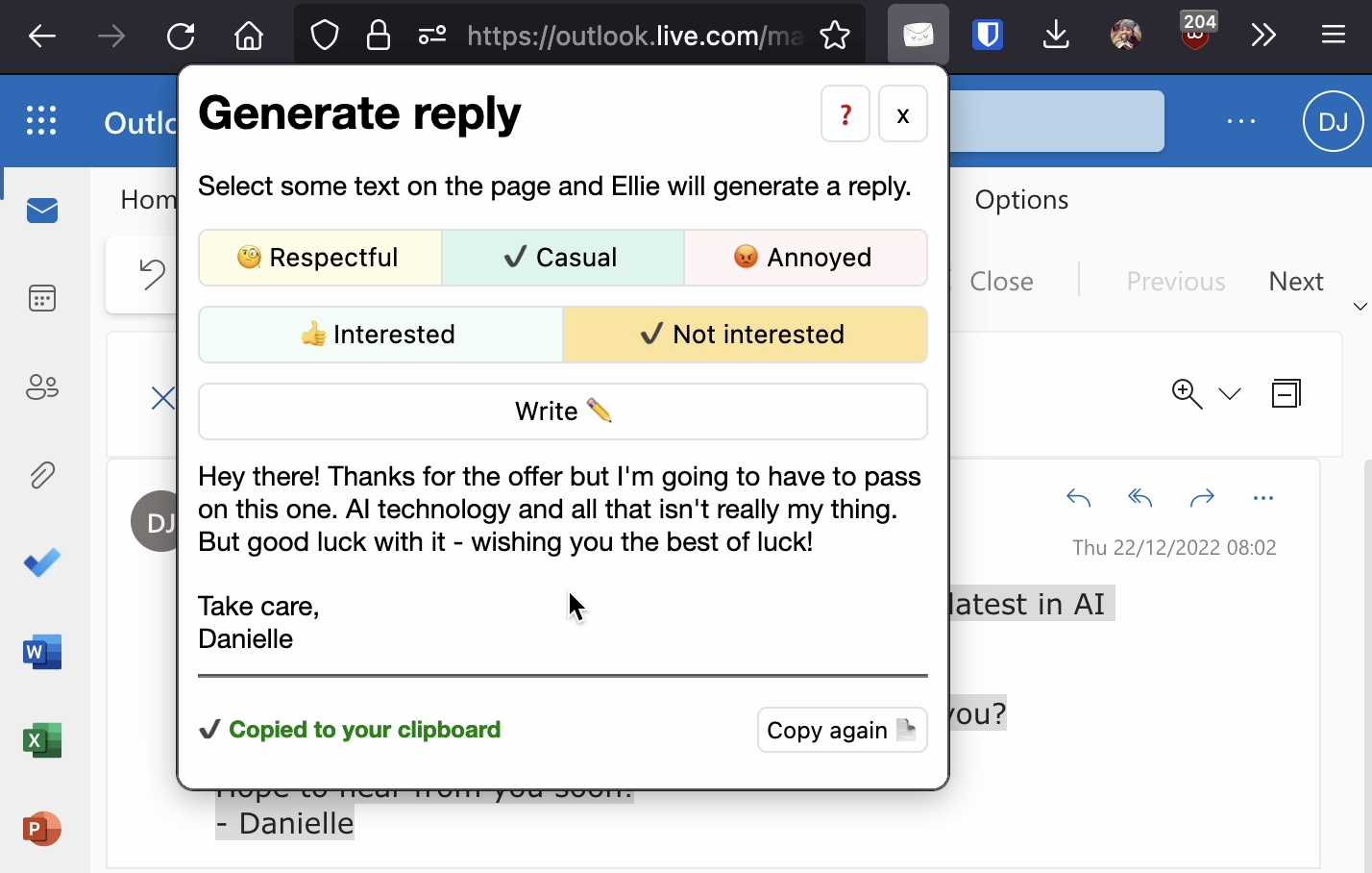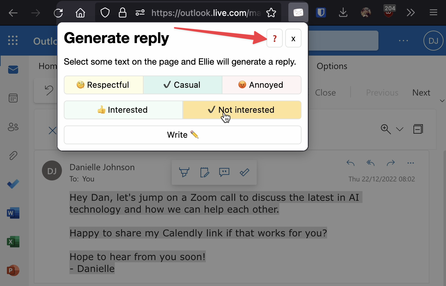 Ellie can write replies to emails anywhere via a pop-up. This is a great shortcut to use Ellie for other email providers such as Outlook, Fastmail, Apple Mail etc, or even LinkedIn and Twitter DM's. Here's how to use it: