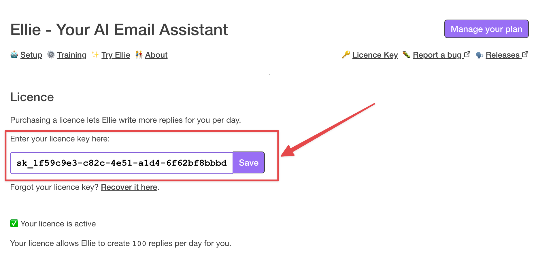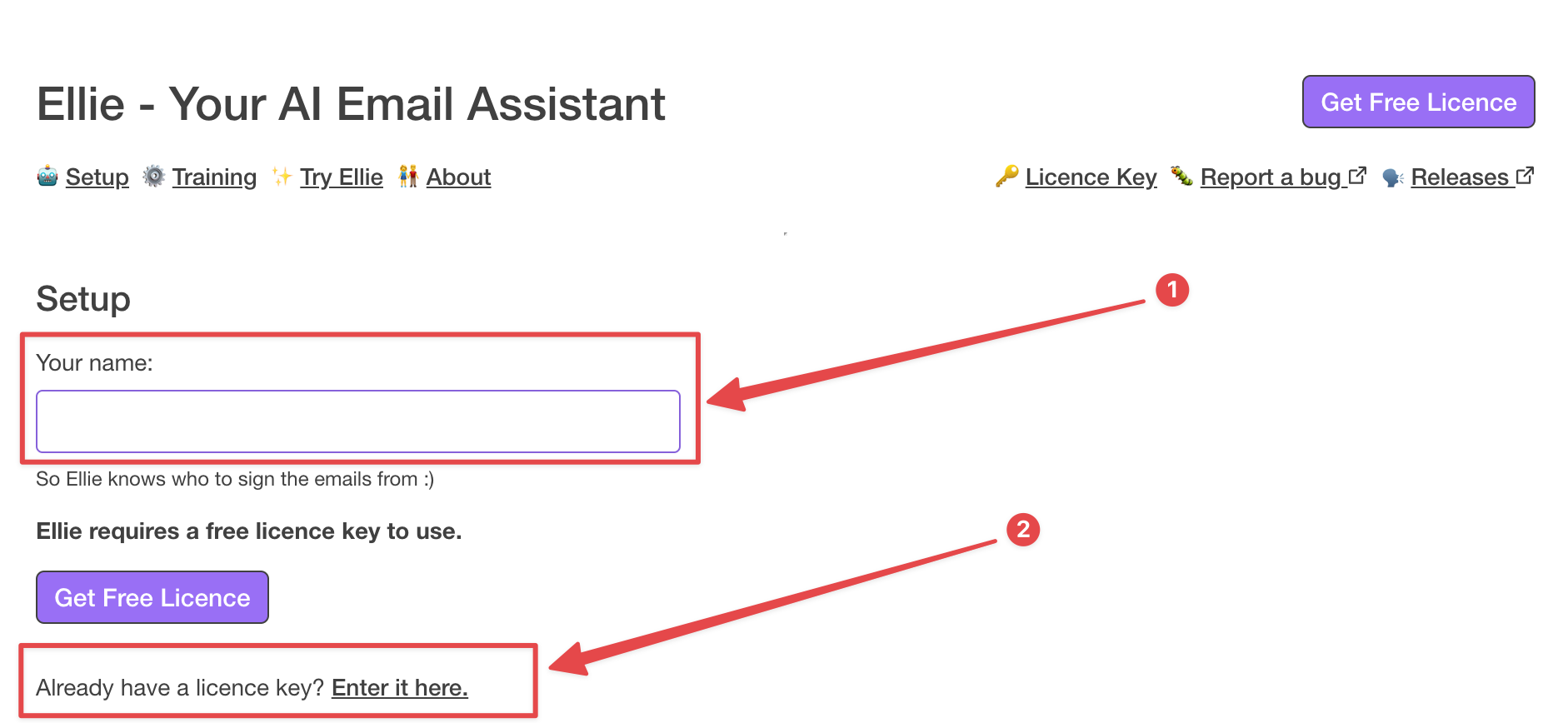 Enter your name so Ellie knows who to sign the emails from, and navigate to the licence key page.